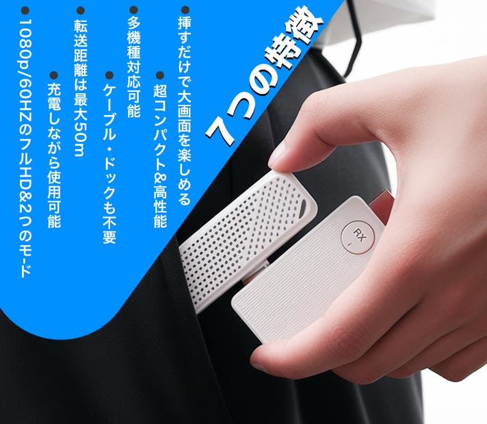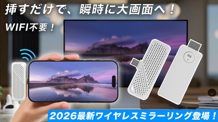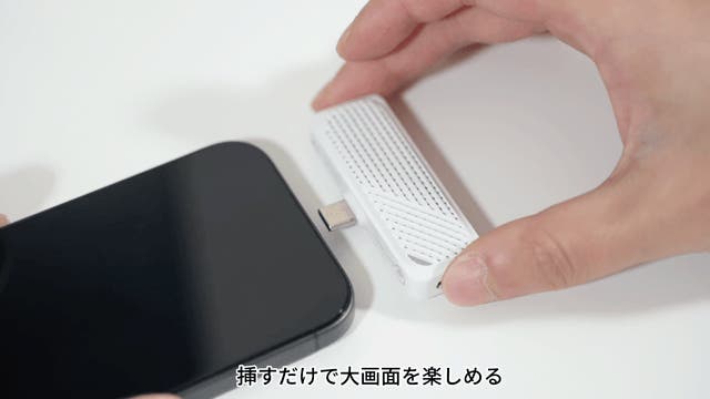 スマホやPCに接続するだけのシンプル設計。面倒な設定は一切不要で、デバイスに挿すだけですぐに大画面へミラーリングできます。会議資料の共有や動画視聴など、ビジネスシーンからプライベートまで幅広く活躍します。