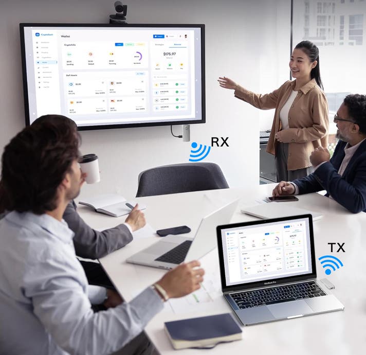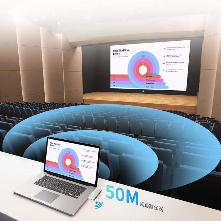 広い会議室や教室でも、離れた場所から安定したスムーズなワイヤレス伝送が可能です。