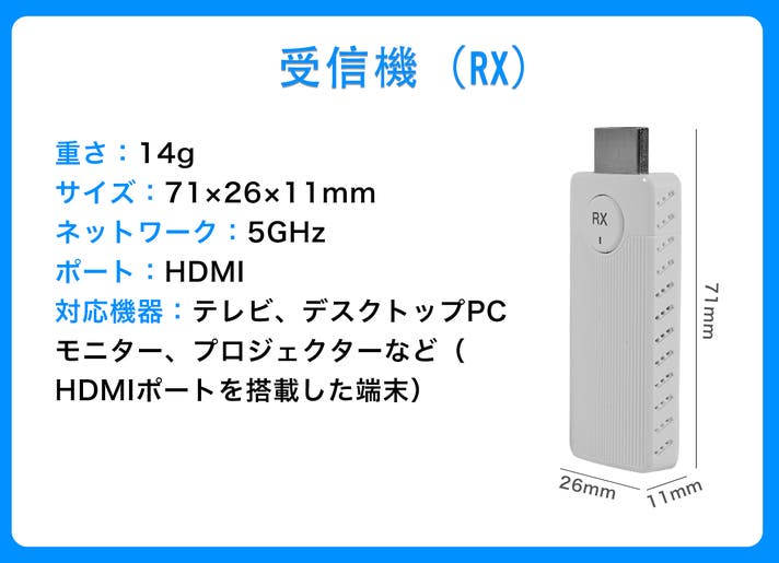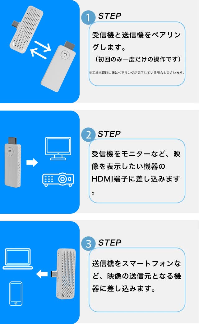 送信機と受信機を挿すだけで、すぐにミラーリング開始。Wi-Fi接続や面倒な配線、ドライバーのインストール、アプリ設定は一切不要。初めての方でも簡単にお使いいただけます。