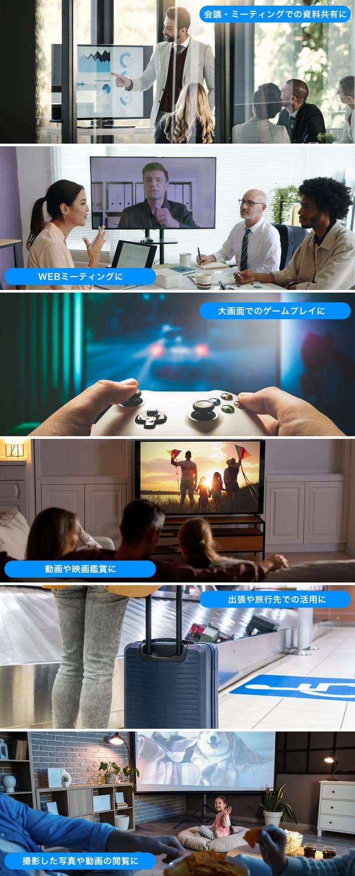 ビジネスシーンでの会議やプレゼンテーションはもちろん、プライベートでの動画視聴やゲームなど、さまざまな場面で活用できます。