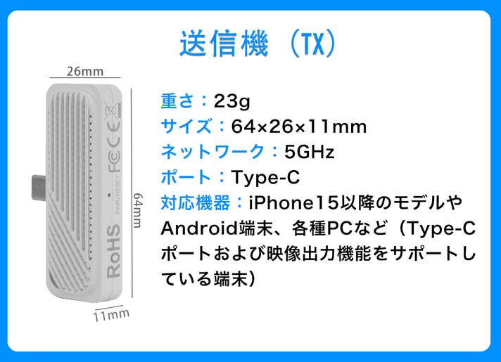 ※通信距離「最大50m」は、電波干渉の少ない開放環境で、送信機と受信機の間に遮蔽物がない条件下で測定した参考値です。実際の使用環境(壁・家具などの遮蔽物、Wi-Fi等の電波干渉)により、通信距離は短くなる場合があります。