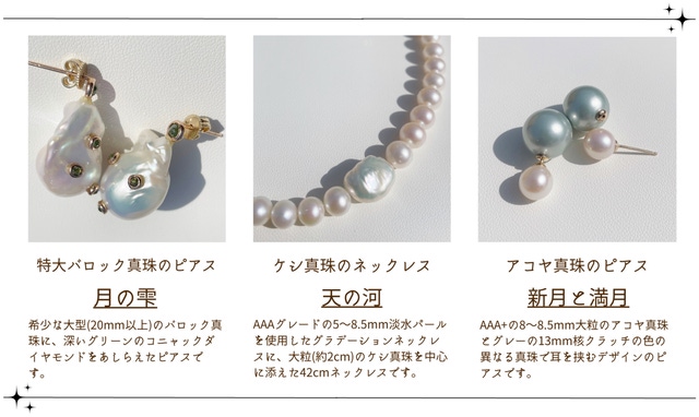 今回は異なる照りを持つ【バロック真珠】【ケシ真珠】【アコヤ真珠】を採用した、3つのジュエリーを用意しました。