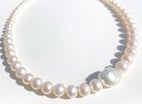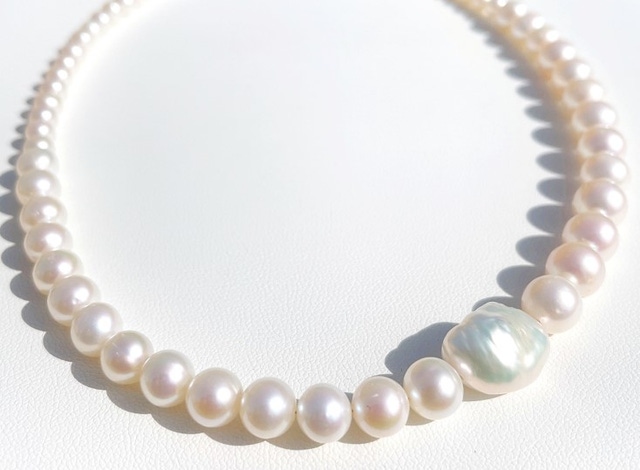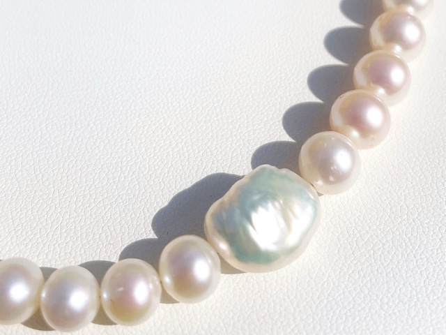 AAAグレードの5〜8.5mm淡水パールをサイズ順に配置したグラデーションネックレスに、特大(20mm前後)のケシ真珠を添えた42cmネックレスです。