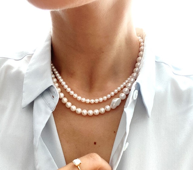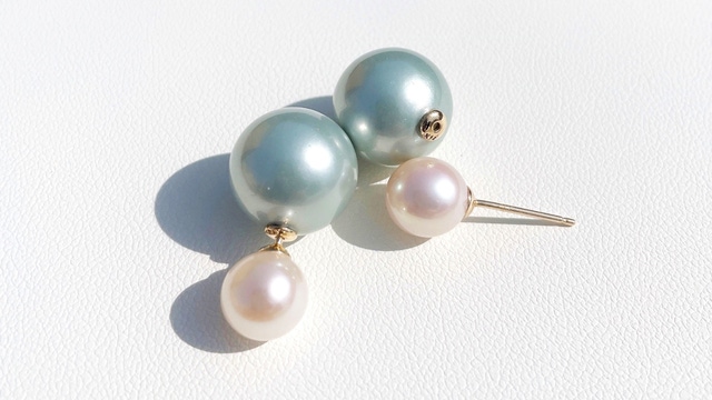 照りの良いホワイトパールと青みがかったグレーパール、それぞれが異なるサイズであることもアクセントとなっています。
