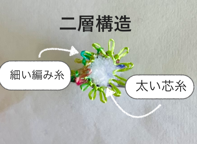 画像の様に、太い芯の糸を、細い糸が周りを囲うように編み込んで作られています。