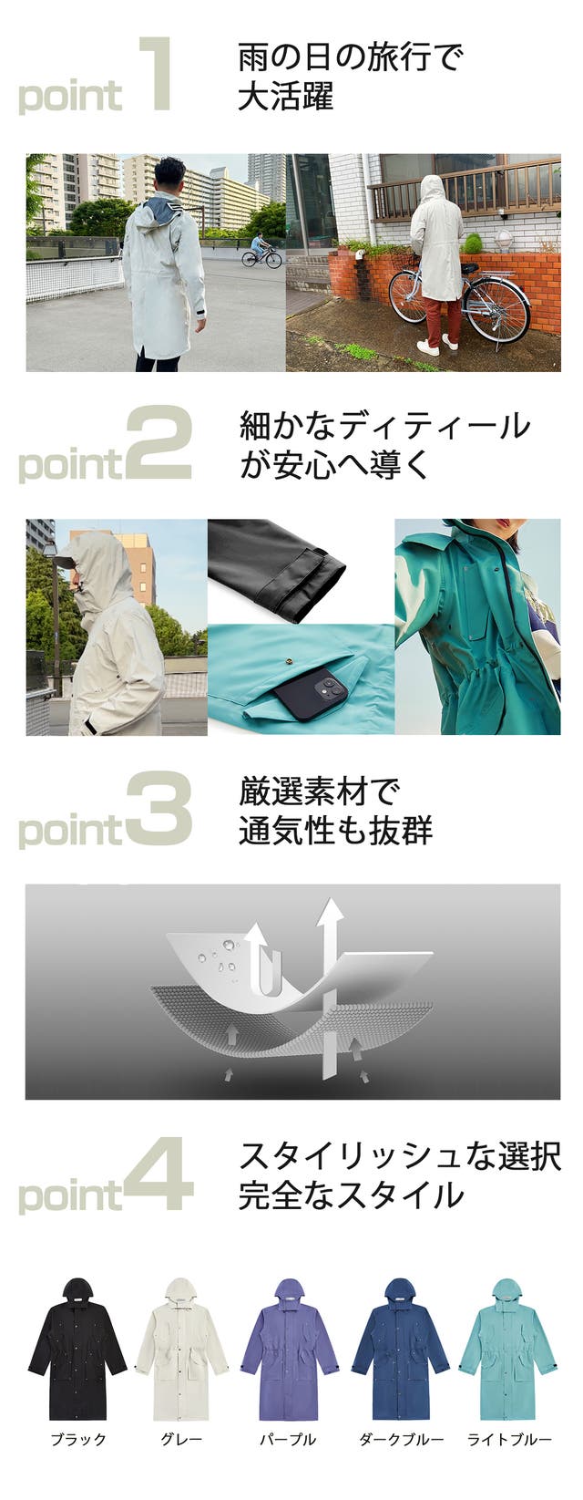 機能性とファッション性を両立させたデザインは、無粋な前世代的な「雨合羽」や「山登り」のイメージとは異なる都会に似合うアウターとしてのデザインの目指して作成しました。