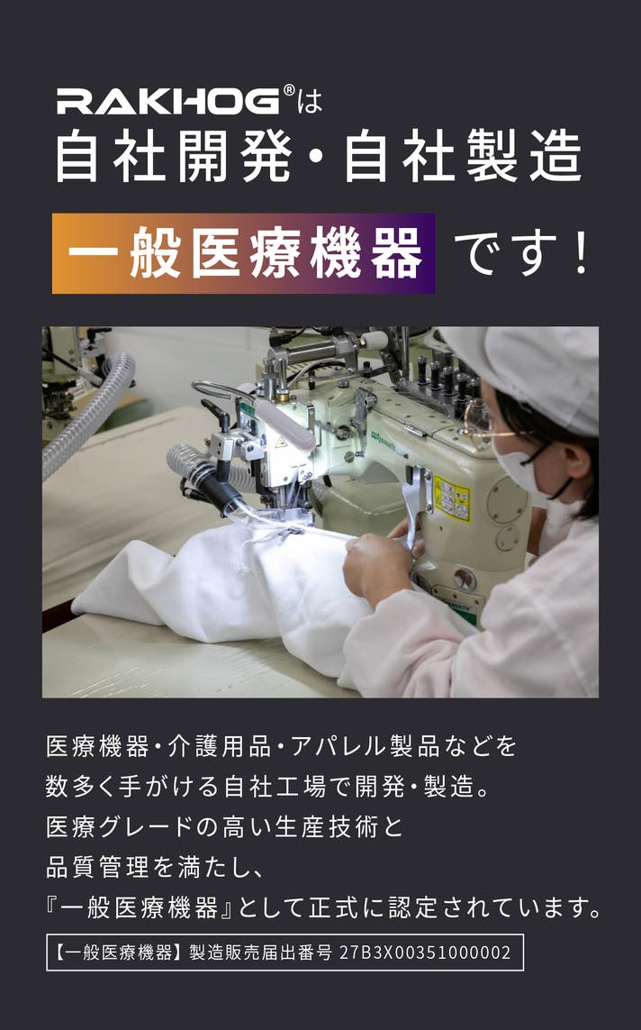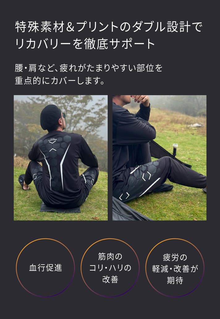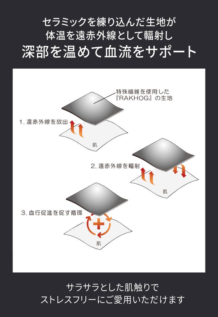 【配送遅延とキャンセルについて】 リターン配送予定月から 3ヶ月 を超えた場合には、希望者に限りキャンセルにて対応させていただきます。 【商品等の不具合による返品・交換】 ◾️対応条件:お届けから1週間以内 ◾️返品・再送の送料:弊社負担 ◾️返金:交換品の在庫が無い場合は返金で対応いたします。 【一般的名称】家庭用遠赤外線血行促進用衣 【届出番号】27B3X00351000002 【使用目的又は効果】 遠赤外線の血行促進作用 ・血行促進効果による血流改善 ・疲労軽減 ・筋肉のハリ、コリの軽減・筋疲労症状の改善 【使用方法等】 ①適応範囲よりサイズを選定してください。 ②本製品は再使用可能です。 ③衣類として素肌に直接着用してください。 ・本品の効果には個人差があるため、長期着用が望ましい。 ・睡眠時の着用は、発汗作用が高まることから、十分な水分補給を行ってください。 ・湿気や日光(紫外線)の影響を受けたり、長期の使用 による経年劣化で伸びが生じたりする場合がございますので、ご注意ください。 ・サイズが合わないものや、2重ねの着用はしないでください。 【使用上の注意】 ・発赤、水疱、湿疹、かぶれ、傷口など皮膚に異常がある時は使用しないでください。 ・皮膚に異常(発赤、水疱、湿疹、かゆみ、かぶれ)を感じたら使用を中止してください。 ・洗濯で色落ち、移染する場合があるので他の物と分けて洗濯してください。 ・着用や洗濯、摩擦により他の物に色移りする場合があるのでご注意ください。 ・長時間水に浸けたり、濡れたまま重ね置きしたりすると、淡色部分や他の物に色移りする場合があるのでご注意ください。 ・蛍光漂白剤の入っていない洗剤をご使用ください。 ・塩素系漂白剤及び酸素系漂白剤は使用しないでください。 ・タンブラー乾燥の使用は避けてください。 ・長時間の摩擦や揉み作用で毛玉が出来た場合、ハサミや毛玉取り器で取り除いてください。 ・直射日光を避け、日陰干ししてください。 ・素材の特性上、水洗いで多少縮みます。 【保管方法及び有効期間等】 ・直射日光、水濡れ、高温、多湿な環境を避けて室温保管してください、 ・しばらく使用しない時は一度干してから、湿気のない場所で保管してください。 ・有効期間:2年間
