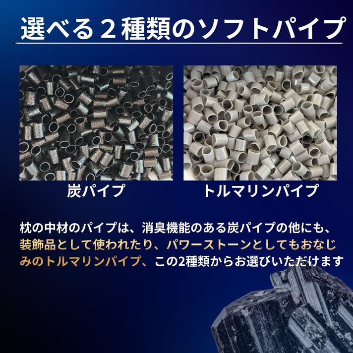 パイプは炭とトルマリン、まくら生地もブラックとホワイト、それぞれ選べます。お色はどちらも、あなたの寝室の美観を邪魔しない落ち着きのあるカラーを選定しております。