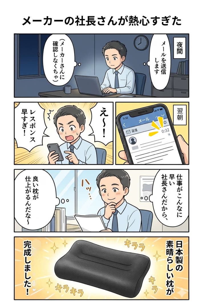 睡眠コンサルタントの有資格者である、メーカーの社長さんが、今回の枕の開発に直接かかわり監修を行っております。