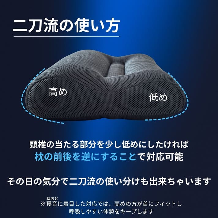 - 首にフィットして自然な休息姿勢をサポート。仰向けも横向きも心地よく、静かな眠りの環境を整える枕