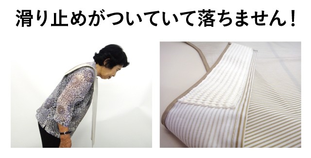 左右の肩掛け部の裏側に滑り止めがついているので落ちにくいようになっています。