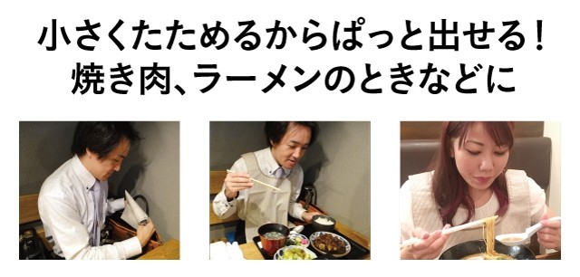 ランチのお供に。小さく折りたためるので、鞄の中に入れておけば麺類や汁物も安心して召し上がれます。サラリーマンやOLの方にもお勧めです。