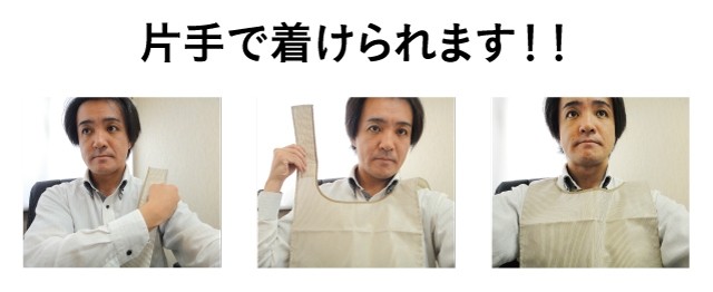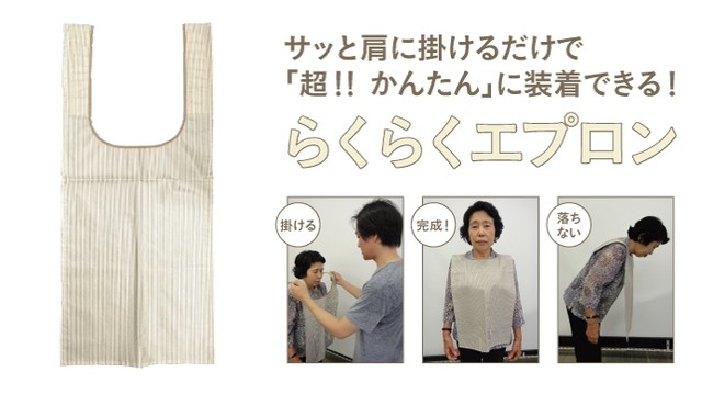 そこで妻の青木範子が考案したのが「らくらくエプロン」。片手で肩に乗せるだけで、かんたんに着けられます。