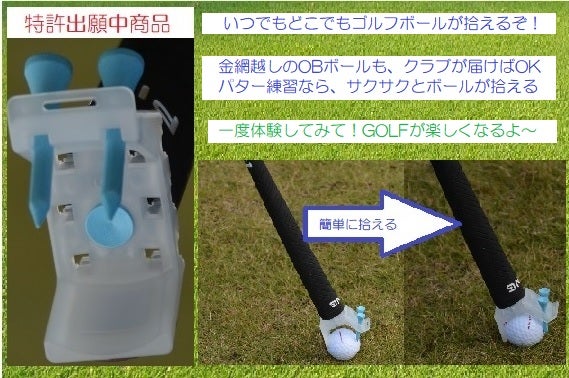 商品としては、立ったままボールが拾える事で、腰痛や足腰の不安のある方や、女性ゴルファーのファッションやスカートなどを気にする事なく、ゴルフクラブのヘッド部分を持ち拾いたいボールに軽く押し当てるだけで簡単にゴルフボールが拾え、足腰の負担の軽減や、かっこよくボールが拾え、パター練習に使えば2個・3個の散らばったボールもサクサクと拾えて気分爽快です。