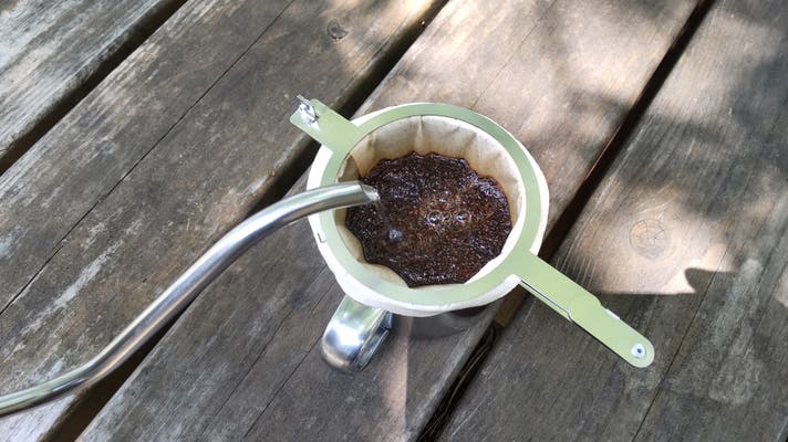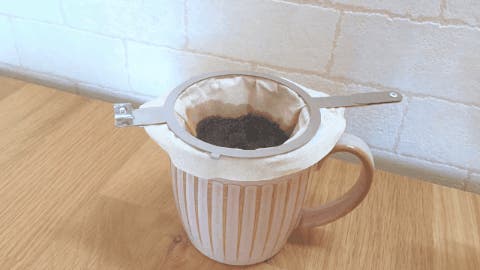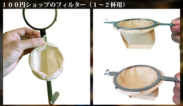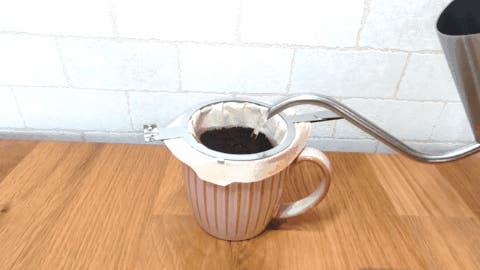そのため、粉の入ったコーヒーフィルターをカップのフチに沿わせて指で押さえ、そこにケトルからお湯を注いでいました。