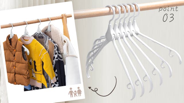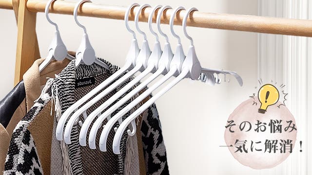 服の種類によってサイズや生地の厚み、重さは少しずつ違います。収納したい服の形に合ったハンガーを選ばないと型崩れやシワなどの原因にもなります。このハンガーを使うことで、どんな服でも生地が傷むのを抑えつつ収納しやすくなります。