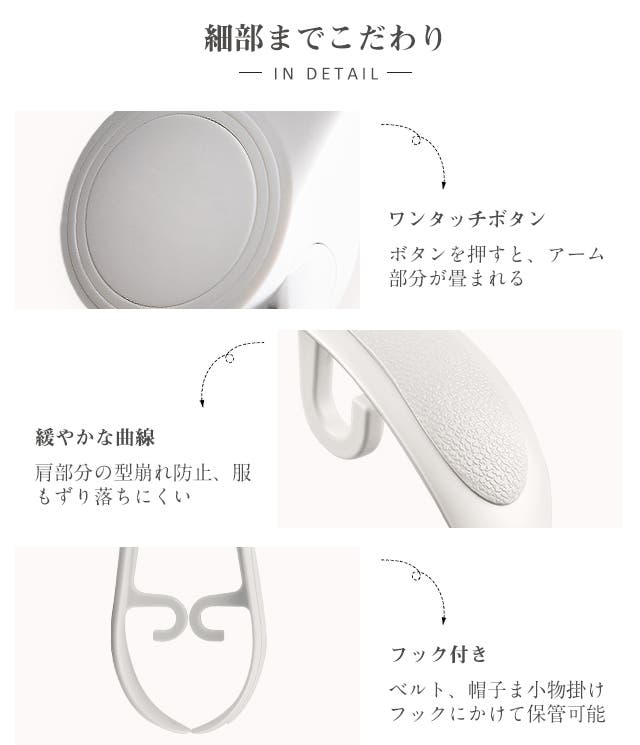 ハンガーは洗濯物を干すときや、洋服をきれいに収納したいときに欠かせないアイテムです。普通のハンガー使用時に「洗濯干しと収納が面倒」、「ハンガーのサイズが合わない」、「洋服が形崩れしてしまう」、「襟・首元を引っ張ってしまう」という声もよく聞きます。そこで、もっと手軽で簡単に収納でき、形崩れ防止できる方法と考え、このワンタッチボタン折りたたみ式ハンガーを開発しました。皆様により便利で快適な生活を送りたいと思います。