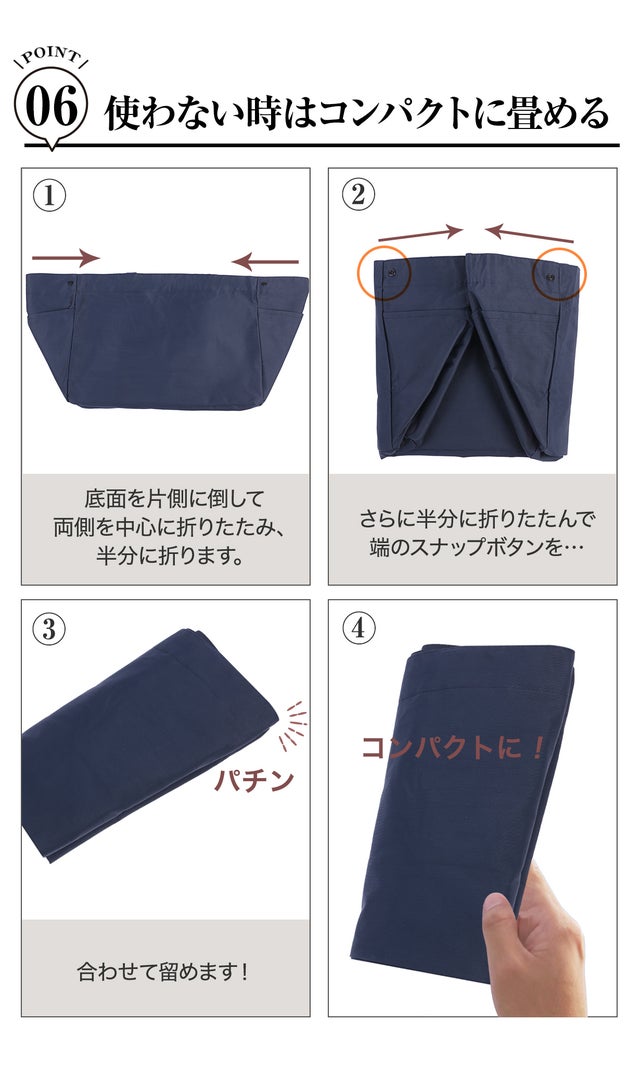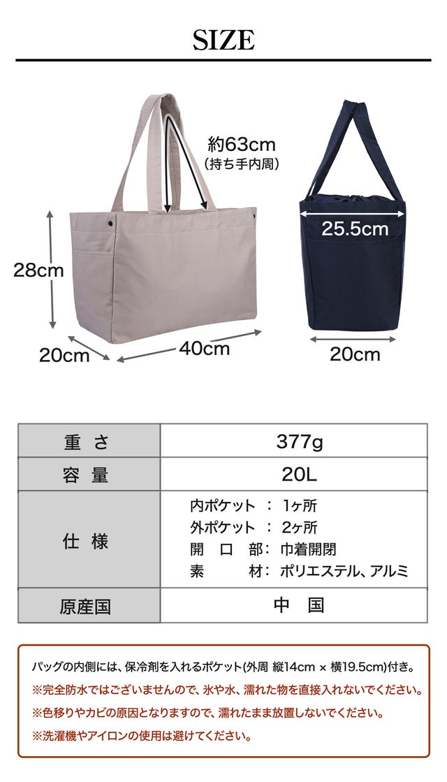スーパーでの買い物だけではなく、アウトドアでの利用も考え、撥水性の高い生地を表側の生地で採用、中の素材はアルミシートにより、保冷効果があります。
