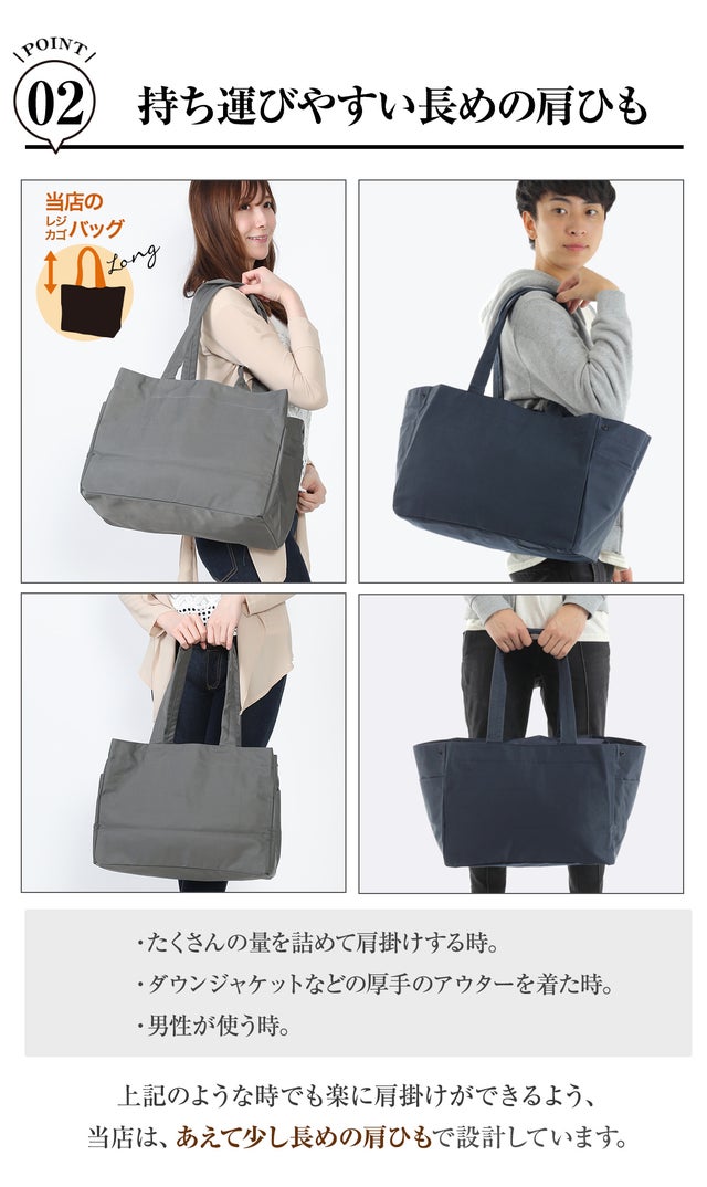 より使いやすさを求め、性別や体格に関わらず持ちやすい長さの手持ちに調節、より手触りのいい生地への変更、また表面と中袋の色を統一したシンプルなデザインなどの改良を加え、オリジナル商品楽レジバッグ(レジカゴバッグ)として、今回展開に至りました。