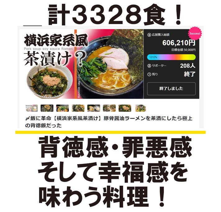 「Makuake(マクアケ)」は、実行者の想いを応援購入によって実現するアタラシイものやサービスのプラットフォームです。このページは、 フードカテゴリの 「背徳の極み!マシ盛り豚ラーメン茶漬け&ピリ辛横浜家系ラーメン【ラー茶ver2】」プロジェクト詳細ページです。
