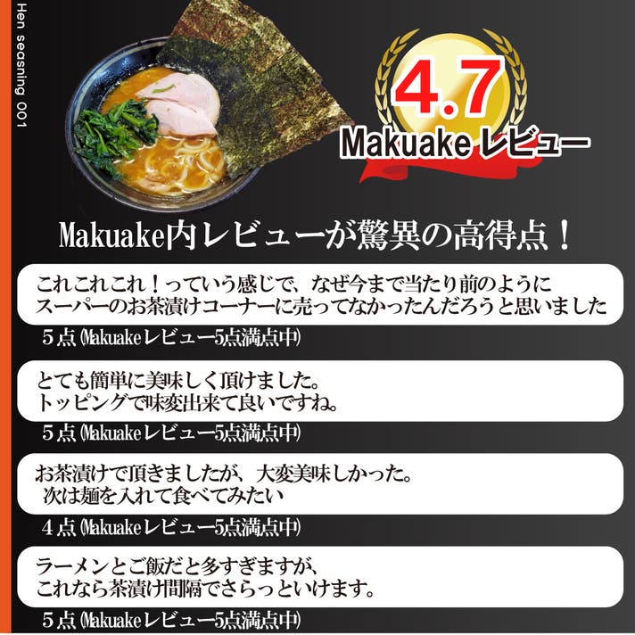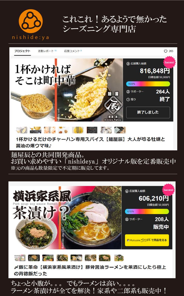 「名店のチャーハンスパイス」や「ラーメン茶漬け」などMakuake内でご好評頂いております。またプロジェクト終了後は公式サイトで一般販売させて頂いております。