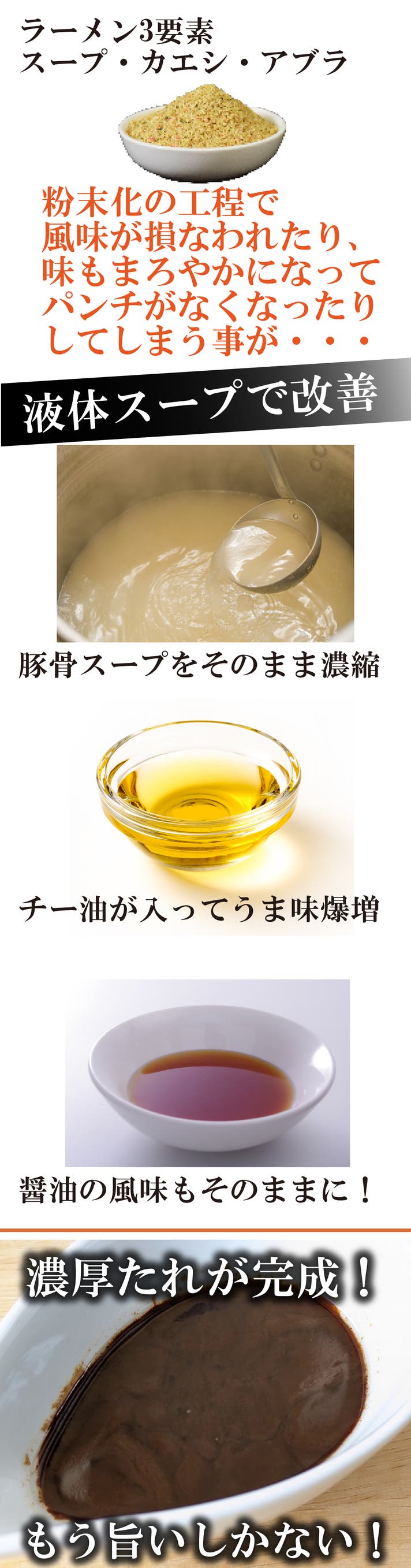 - 粉末から液体化により、豚骨の旨味や風味が倍層!家系ラーメンの再現度が爆上がり