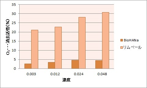 同一濃度のヒアルロン酸と消去酸素実験をしたところ、ヒアルロン酸に比べ当社商品の原料であるフコイダンが約6倍程度の抗酸化作用が確認されています。