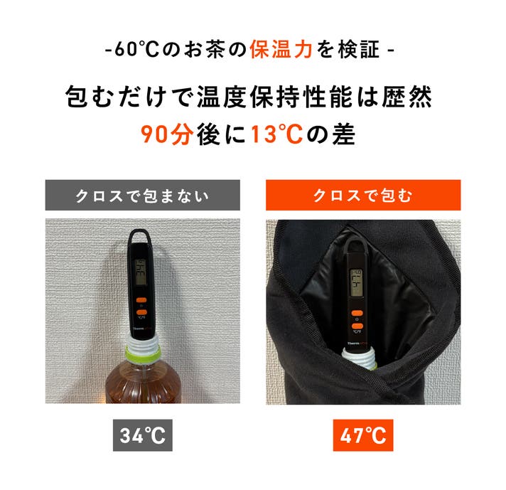 室温27℃の環境下で、温かいお茶の入った500mlペットボトルを①レンジクロスで包んだ場合②包まない場合で、30分後・60分後・90分後の水温を計測しました。