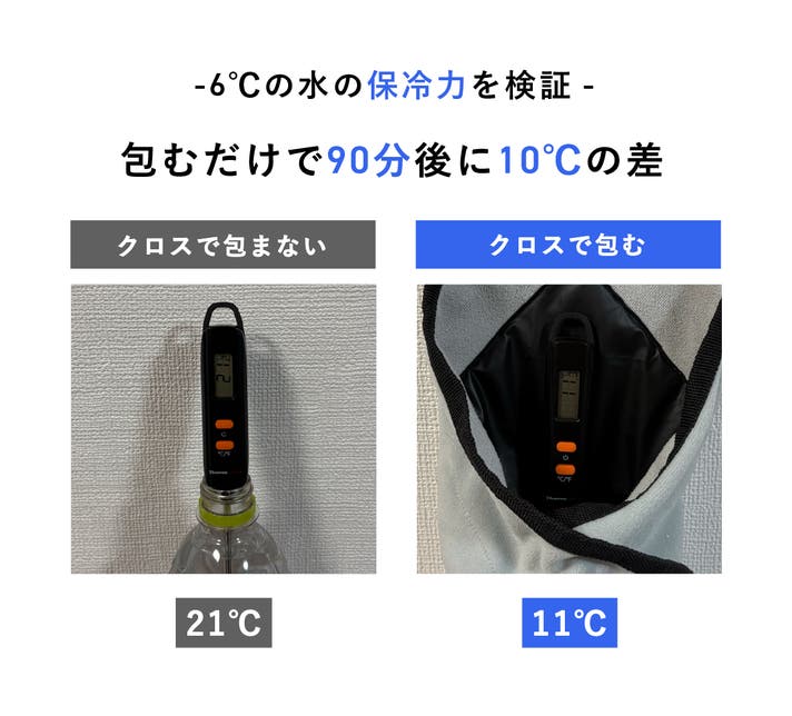 室温27℃の環境下で、冷たい水の入った500mlペットボトルを①レンジクロスで包んだ場合②包まない場合で、30分後・60分後・90分後の水温を計測しました。