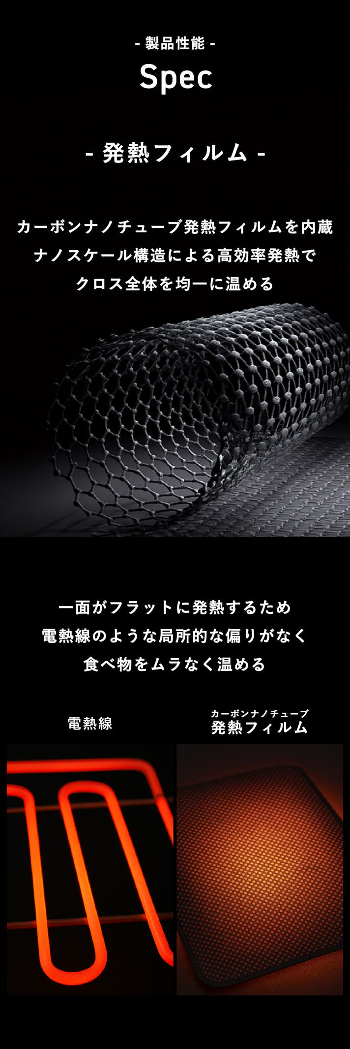布のような柔軟性を持つ素材が面全体で熱を伝えるため、加熱ムラのない均一な仕上がりを実現します。