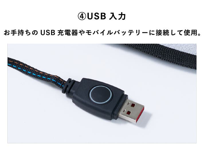 USB Type-A給電です。モバイルバッテリー、PC、ACアダプターから簡単に電源をとれます。