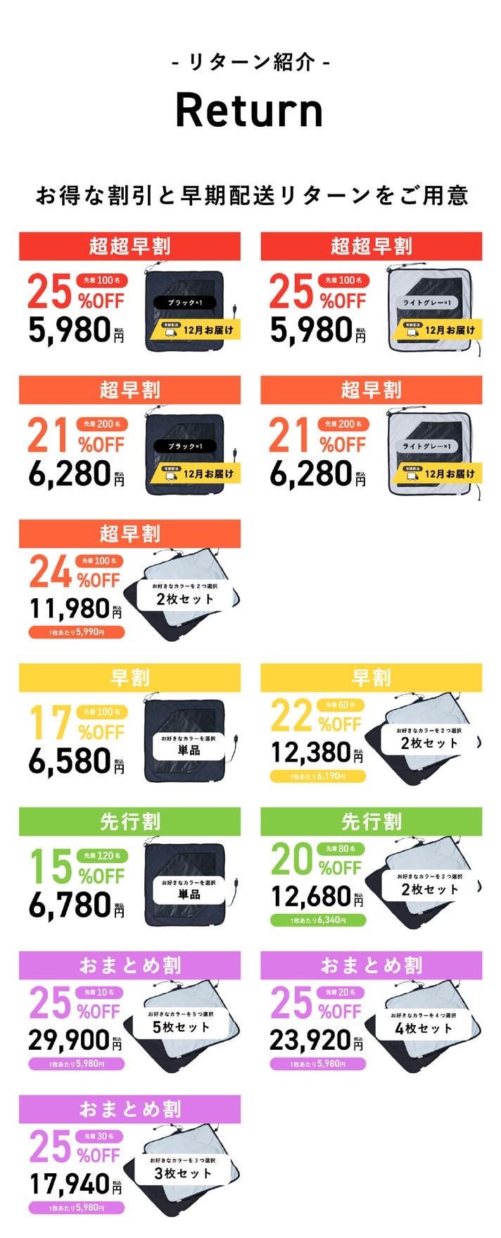 【配送遅延とキャンセルについて】 本文中に記載させていただいたスケジュールは、あくまでプロジェクト公開時点の予定です。応援購入の性質上、配送遅延のおそれがございます。原則として、配送遅延に伴う応援購入のキャンセルはできませんが、リターン配送予定月から 3ヶ月 を超えた場合には、希望者に限りキャンセルにて対応させていただきます。 ※ご注文状況、使用部材の供給状況、製造工程上の都合等により出荷時期が遅れる場合があります。 ※一部国内に類似品が出回っている可能性がございます。弊社では他社の類似品に関してのお問い合わせには対応できませんので、ご了承ください。弊社商品のオリジナル性については、上記プロジェクトに関する情報をご覧ください。 【商品等の不具合による返品・交換】 原則として、サポーター都合によるキャンセル・返金は承っておりません。 (サポーター都合のキャンセル不可の例:サイズが合わない、誤注文、長期不在) ◾️対応条件: 商品の初期不良、またはお届けした商品がご注文内容と異なる場合、到着後180日以内にプロジェクトページの「実行者にメッセージ」よりご連絡ください。状況を確認の上、返金対応、または良品との交換対応をさせていただきます。 ◾️返金額: リターン金額(税込)の全額 ◾️返品送料/再送料: 実行者負担 <返品・交換をお受けできない商品> ・サポーターの責任により破損、汚損が生じた商品 ・商品のタグ、付属品、パッケージ(箱、袋など)を紛失、破棄された商品 ・事前にご連絡をいただいていない商品 ・商品到着後、180日以上経過した商品 <交換をお受けできないケース> ・限定品や同一商品の在庫がない場合など、代替品をご用意できない商品