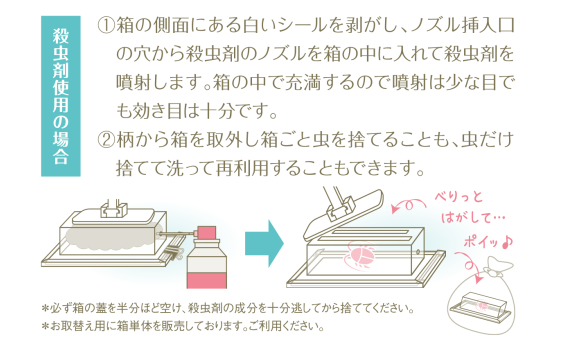 *必ず箱の蓋を半分ほど空け、殺虫剤の成分を十分逃してから捨ててください。