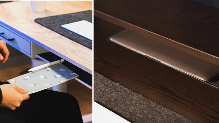 PCトレイにより、ノートPCを置いたり、一次書類やメモ帳を収納可能。トレイを活用することでデスク上の散らかりを防ぎ、効率的で快適なワークスペースを実現します。