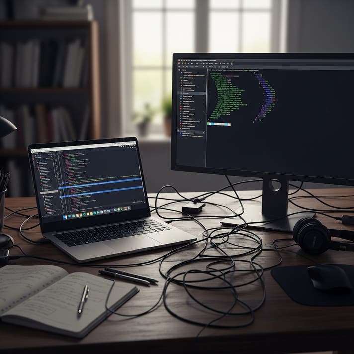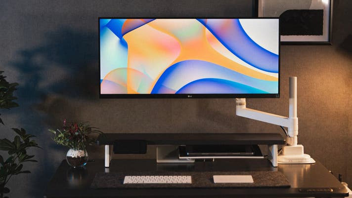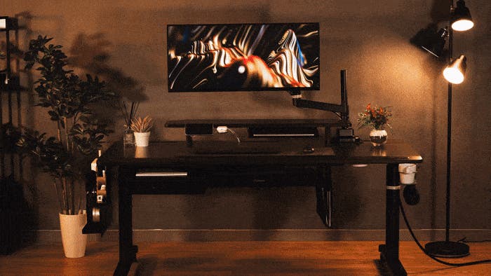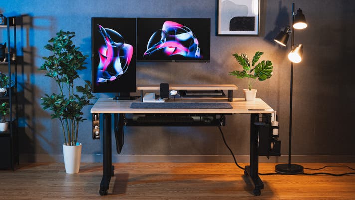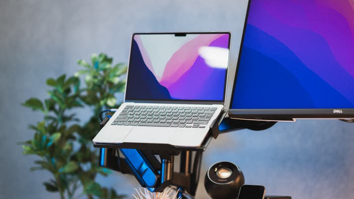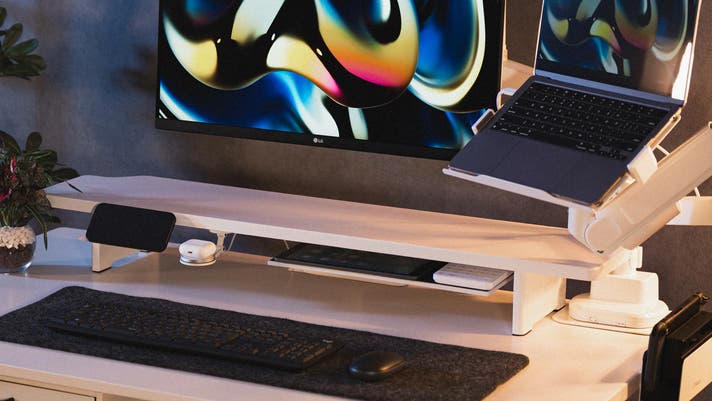 片方のアームをノートPCにすれば、視線の高さを揃えて姿勢がラクに。天板は広々使え、作業や会議に合わせて高さ・角度を瞬時に調整できます。外付けキーボードと組み合わせれば、クラムシェル⇄デュアル表示の切替もスマート。