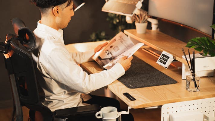 安価なラバーウッドの集成材とは異なり、一枚板を数枚重ね合わせた無垢のアッシュ材を採用。ダイナミックな木目と優れた耐久性を兼ね備え、長く使うほどに味わいが深まります。重厚感のある素材だからこそ、ワンランク上のデスク空間を演出できます。