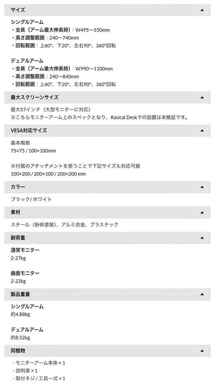 ・Rasical モニターアームシングル×1(全色同一で、ブラック / ホワイトを選択可能)