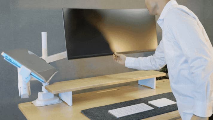 垂直デザインにより、Rasical DeskやRasical Shelfと組み合わせても可動域を制限することなく設置が可能。このおかげでシェルフを最大限後方に下げれるため、限られたスペースを有効的に活かせます。