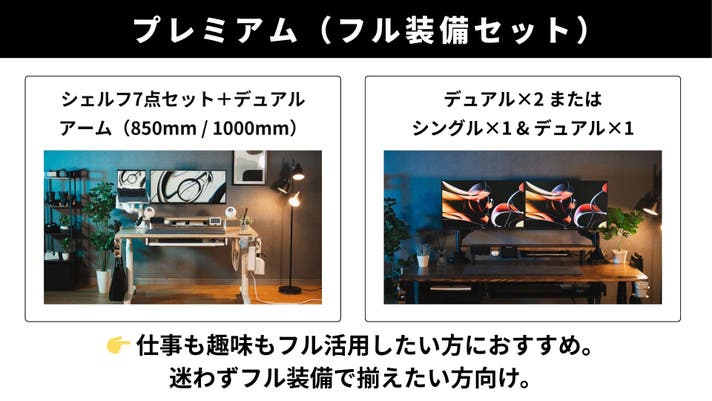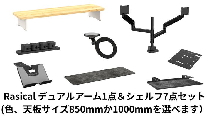 ・Rasical モニターアームデュアル×1(全色同一で、ブラック / ホワイトを選択可能)