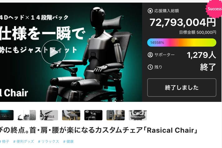 Rasical Chairは、マクアケにて72,793,004円を達成。