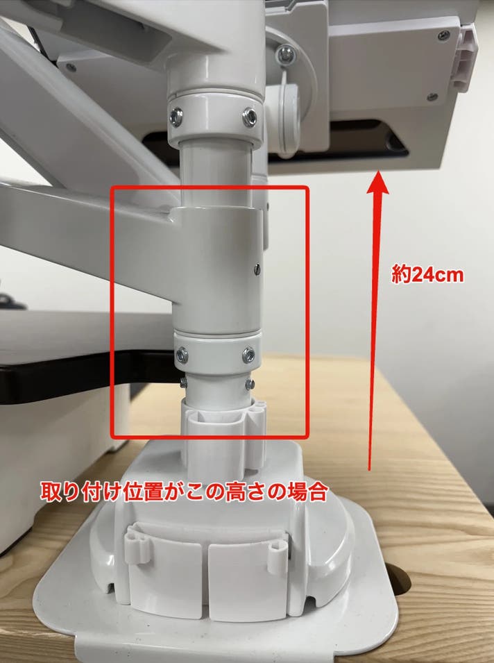 アーム取付位置を最大に下げた状態にして、Macbook14インチの画面を垂直に開いた場合のスタンド最小高さは約24cm、Macbook14インチ自体のモニター最大高さは約61.5cmでした。つまり61.5cmをモニターの高さにすればノートPCとモニターの高さを合わせることが出来ます。ただし、PCや角度により大きく異なりますので、こちらの数値はあくまで参考としてください。これ以上は仕様上下げることが出来ません。