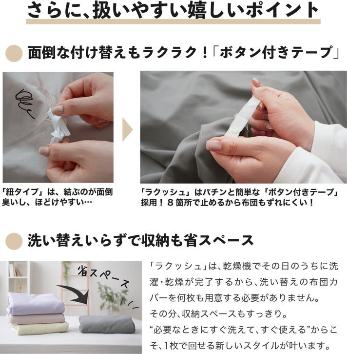 「ラクッシュ」は、ただ便利なだけじゃない、“眠る時間の心地よさ”まで考えた布団カバーです。
