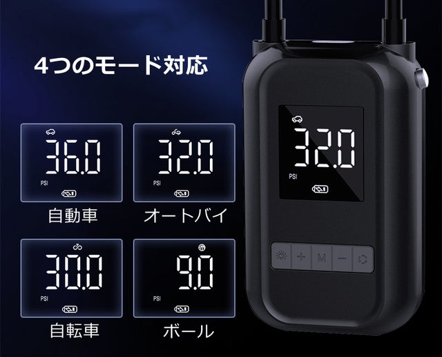 自転車、バイク、自動車、ボールの4つモードに対応します。「PSI」、「BAR」、「KPA」、「kg /cm²」という四種類圧力単位に換算できます。空気入りの対象物に応じてモードや単位を選択できます。