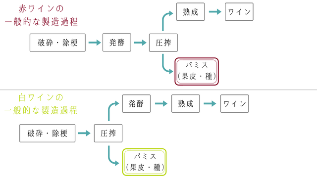 圧搾時に残る果皮・種がパミスになるため、赤ワインの醸造と異なり、果皮・種(パミス)が発酵していないことが一般的です。
