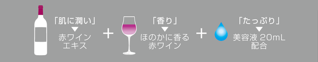 水・プロパンジオール・グリセリン・PEG-60水添ヒマシ油、ワインエキス、ブドウ葉エキス、ブドウ種子油、ヒアルロン酸Na,加水分解ヒアルロン酸、加水分解コラーゲン、水溶性コラーゲン、海水、海塩、グリチルリチン酸2K、ジェランガム、クエン酸Na、クエン酸、BG、シアノコバラミン、香料