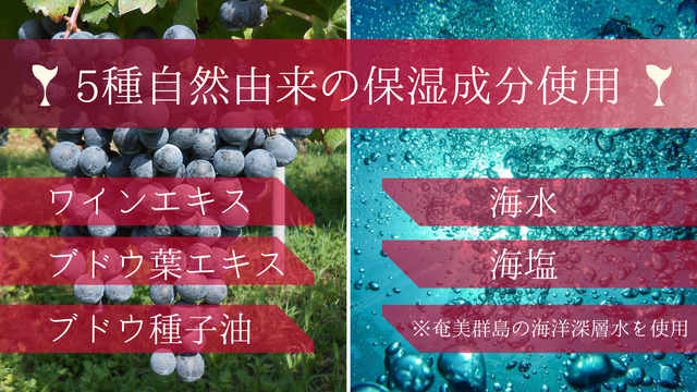 ワインパミスは、ワイナリーから回収後すぐに冷凍保存した赤ワインパミスを使用。海水・海塩には豊かな自然と美しい海に囲まれた奄美群島の海洋深層水を使用するなど、こだわりの自然由来成分を使用しています。