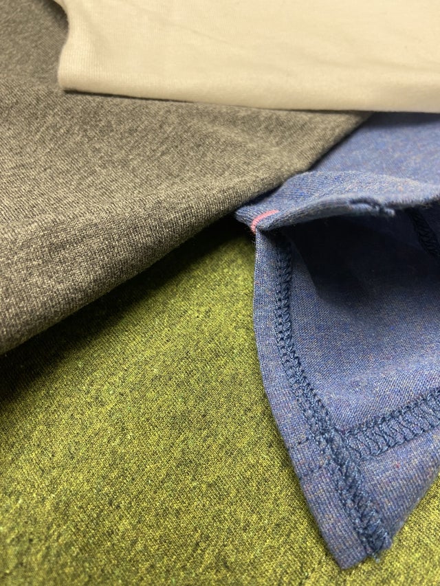 糸がどうやって作られいるかご存じない方は多いと思います。1つ簡単にリサイクル原料を使用した糸の特色をお伝えすると、通常の綿やポリエステルの原料と違い、残った生地や裁断くずを工場で出来る限り細かく粉砕して(「反毛」と言います)かき混ぜて、リサイクルコットン原料を作ります。その綿は普段皆さんが着ているTシャツの生地使われている原料ようもかなり細かい(「繊維長が短い」と言います)です。RE-inbow Tシャツで使用されている糸は、そのリサイクルコットンとリサイクルポリエステルを約半分ずつブレンドしていて、生地にすると、細かい綿繊維を使用している事で、微細な繊維が表面に見える事があります。品質には全く問題ありませんし、リサイクル素材を使用している良い意味での証です。カジュアルTシャツとしてみると、綺麗なカラーとも相まって、良い雰囲気を出してきます。