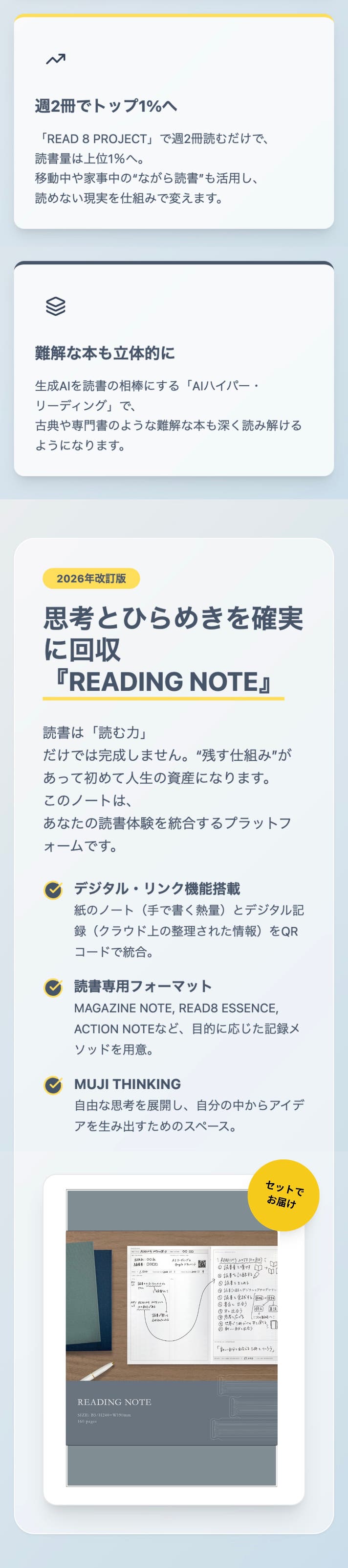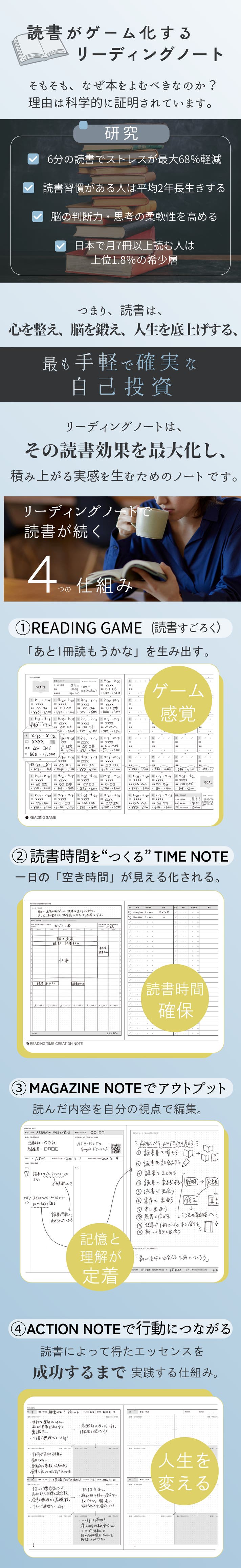 リーディングノートは、月に8冊、年間100冊の読書量を自然と達成できるように設計されています。
