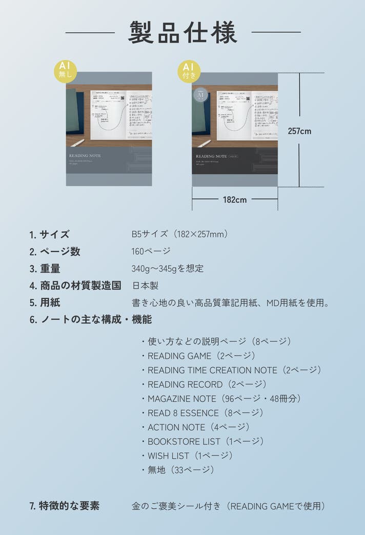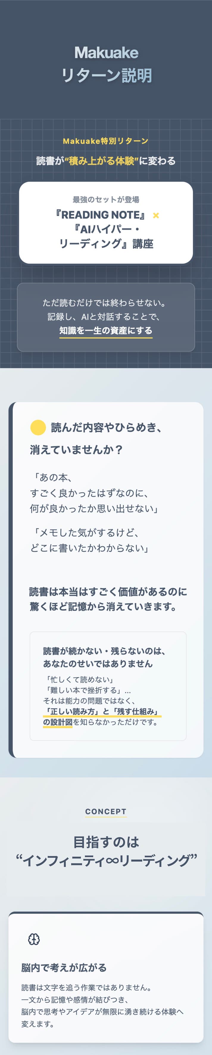 「Makuake(マクアケ)」は、実行者の想いを応援購入によって実現するアタラシイものやサービスのプラットフォームです。このページは、 プロダクトカテゴリの 「「AI×読書×ノート」が融合!読書がゲーム化する「READING NOTE」」プロジェクト詳細ページです。