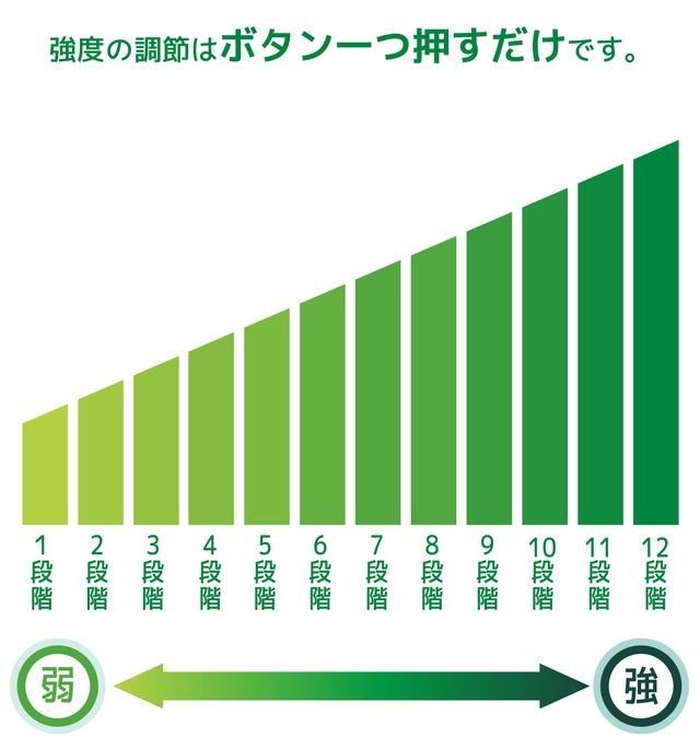 段階の設定もUP/DOWNボタンを一つ押すだけです。ご自身のお好みの強度に合わせてUP/DOWNボタンを押して調節してください。